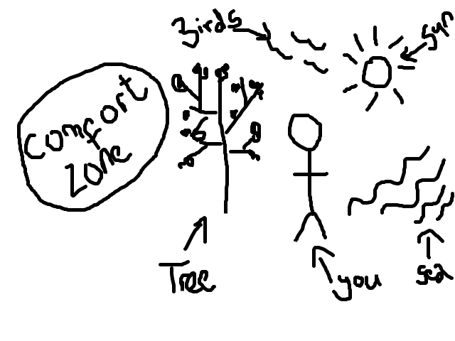 Not only is the picture above a bit shite!! It of course comes fully attached with an intelligent deeper meaning of which I will attempt an explanation to the inner workings of my mind. This particular example is also the simplest version of stepping out of your comfort zone. If you look at it as a whole you can see some environmental stimulants around the stick man, the comfort zone is your house. There is of course safety in the house and hopefully it’s a safe place for you and it also allows for some sensation but the real draw is the comfort. However it can become quite over bearing, so comfortable that we don’t set our sites for anything else or perhaps like me we’re just too scared to.